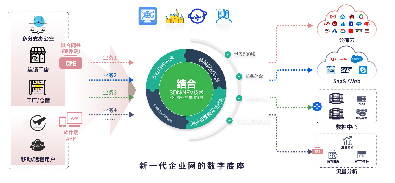 汇聚以云和应用为核心的企业网络流量,提供一体化企业网络服务,包含多分支组网、混合多云连接、应用访问/加速,线上统一可视化管理。为企业广域网全面优化和升级,实现降本增效,提升竞争力。