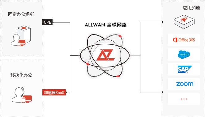 不同区域用户通过在办公室部署Linker/Linker Pro或移动端安装加速器SaaS,就近接入ALLWAN全球网络,由高智云网高速专用通道直达应用服务器,从而实现应用访问质量的提升。
